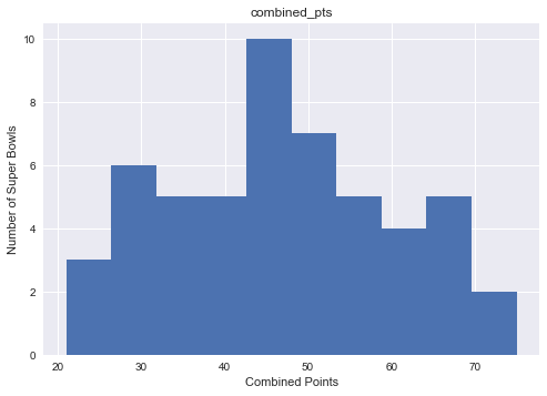 Most combined scores are around 40-50 points, with the extremes being roughly equal distance away in opposite directions. Going up to the highest combined scores at 74 and 75, we find two games featuring dominant quarterback performances. One even happened recently in 2018’s Super Bowl LII where Tom Brady’s Patriots lost to Nick Foles’ underdog Eagles 41-33 for a combined score of 74.
