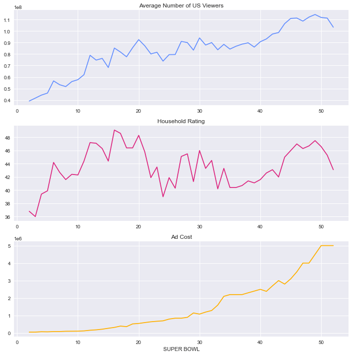 - How have viewership, TV ratings, and ad cost evolved over time?