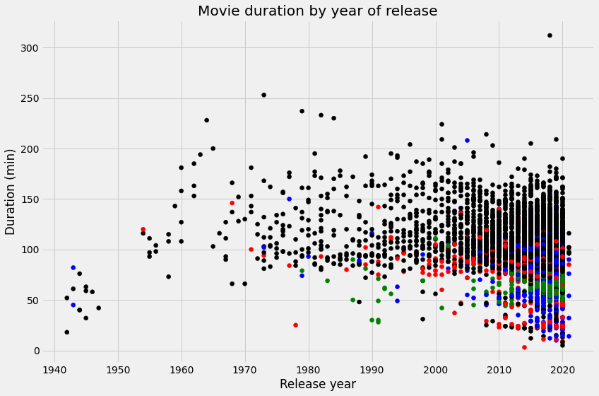 plt.scatter("release_year", "duration",data=netflix_movies_col_subset, c=colors)