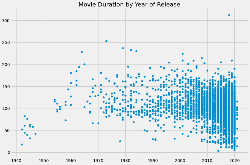 plt.title("Movie Duration by Year of Release")